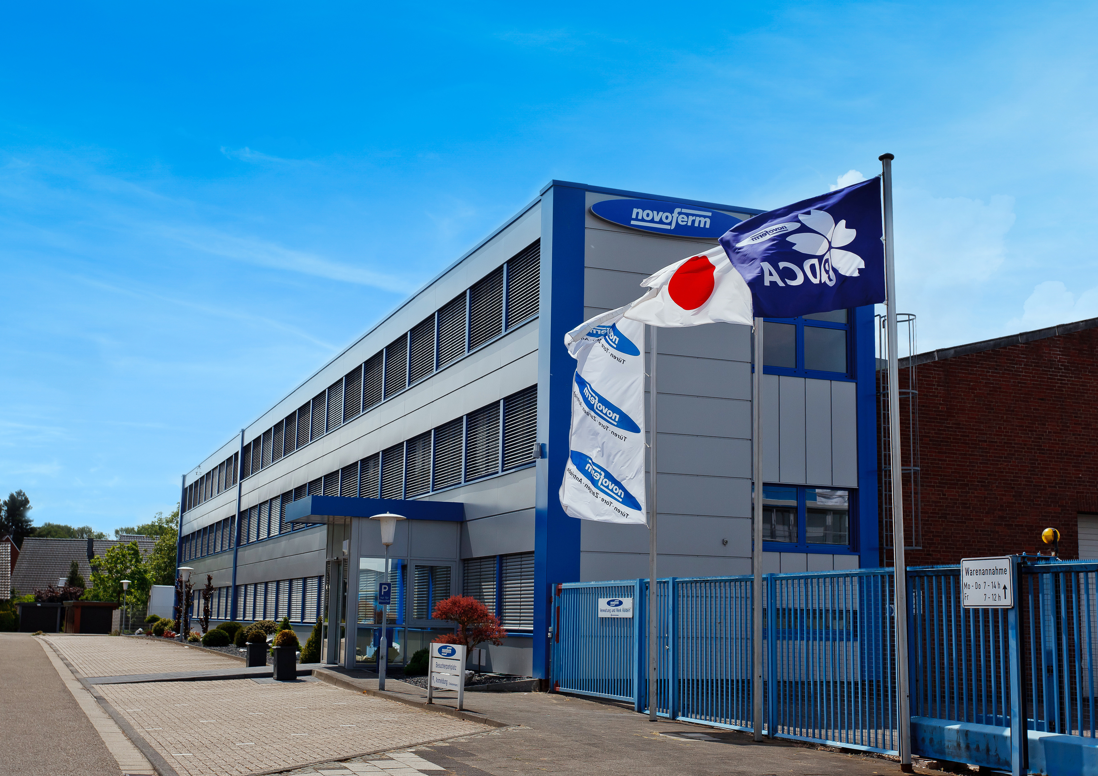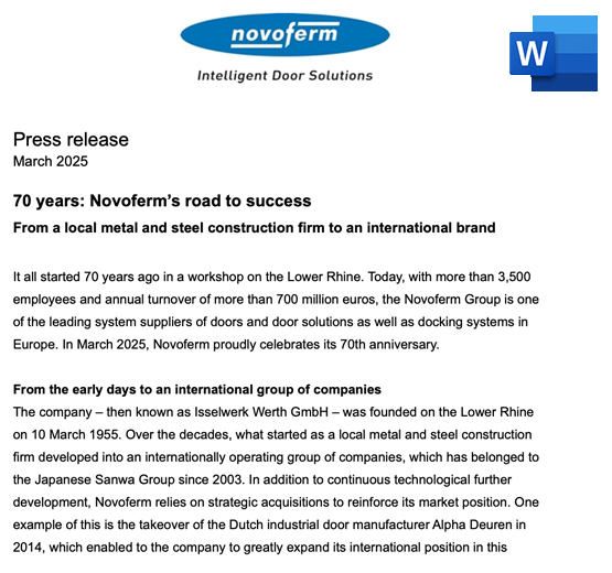 Novoferm is a leading international company for door and gate solutions and loading systems. The company was founded in 1955 as Isselwerk Werth GmbH on the Lower Rhine and has been part of the Japanese Sanwa Group (owned by Sanwa Holdings Corporation) since 2003. The Novoferm Group produces at various locations in Europe and sells products in many countries around the world via numerous national companies and sales partners. Novoferm employs over 3,500 people and is certified to DIN EN ISO 9001.