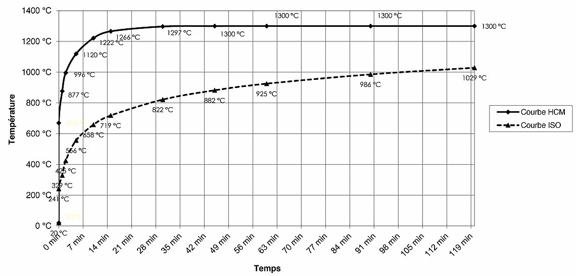 2. Prototypes soumis au feu sur un four suivant une courbe de température normalisée (ISO ou HCM) (Cf. schéma ci-dessous).