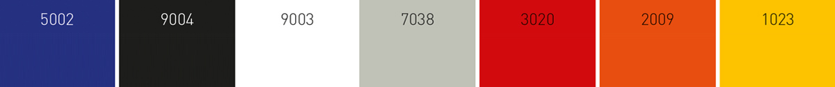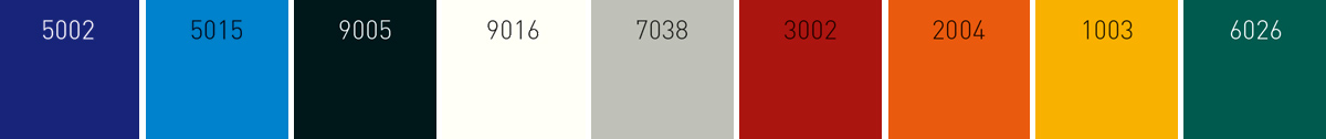 Disponible en standard avec un poids de rideau de 900 g/m², dans les couleurs RAL suivantes :
