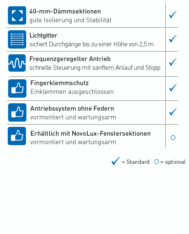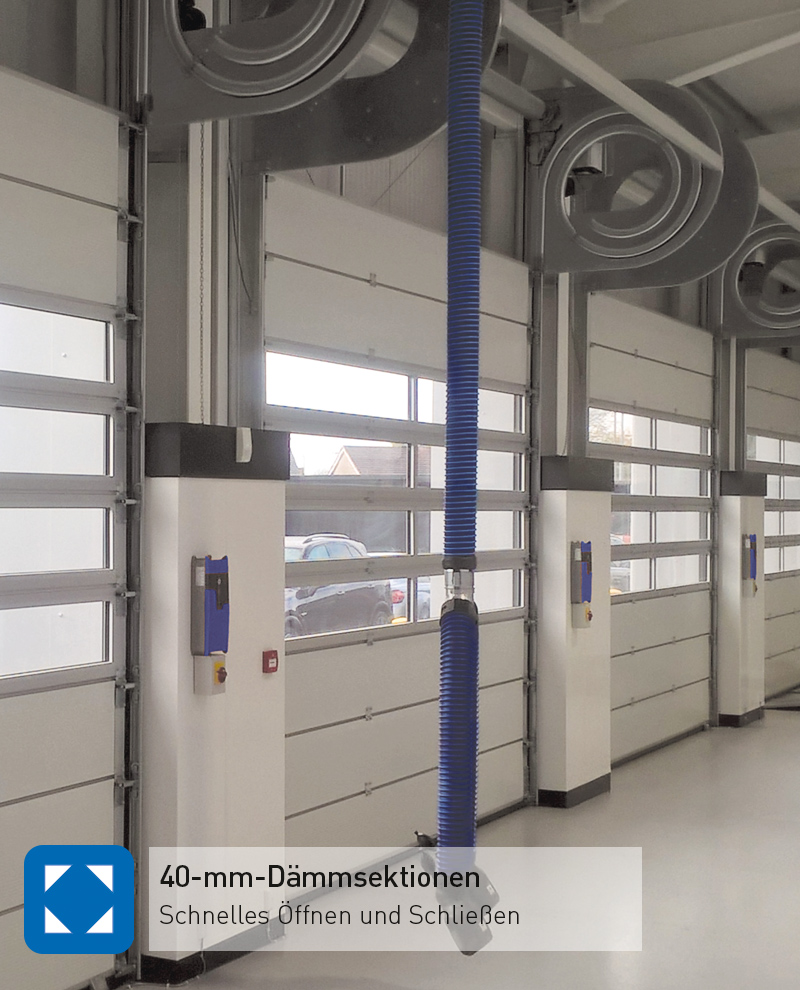 Les locaux à forte fréquentation sont souvent équipés de deux types de portes différents : une porte sectionnelle pour la nuit et une porte rapide pour la journée. La nouvelle NovoSpeed Thermo/S600 rend superflue la porte rapide supplémentaire installée derrière la porte sectionnelle. La NovoSpeed est rapide, offre une protection fiable contre les cambrioleurs et assure également une excellente isolation thermique.
