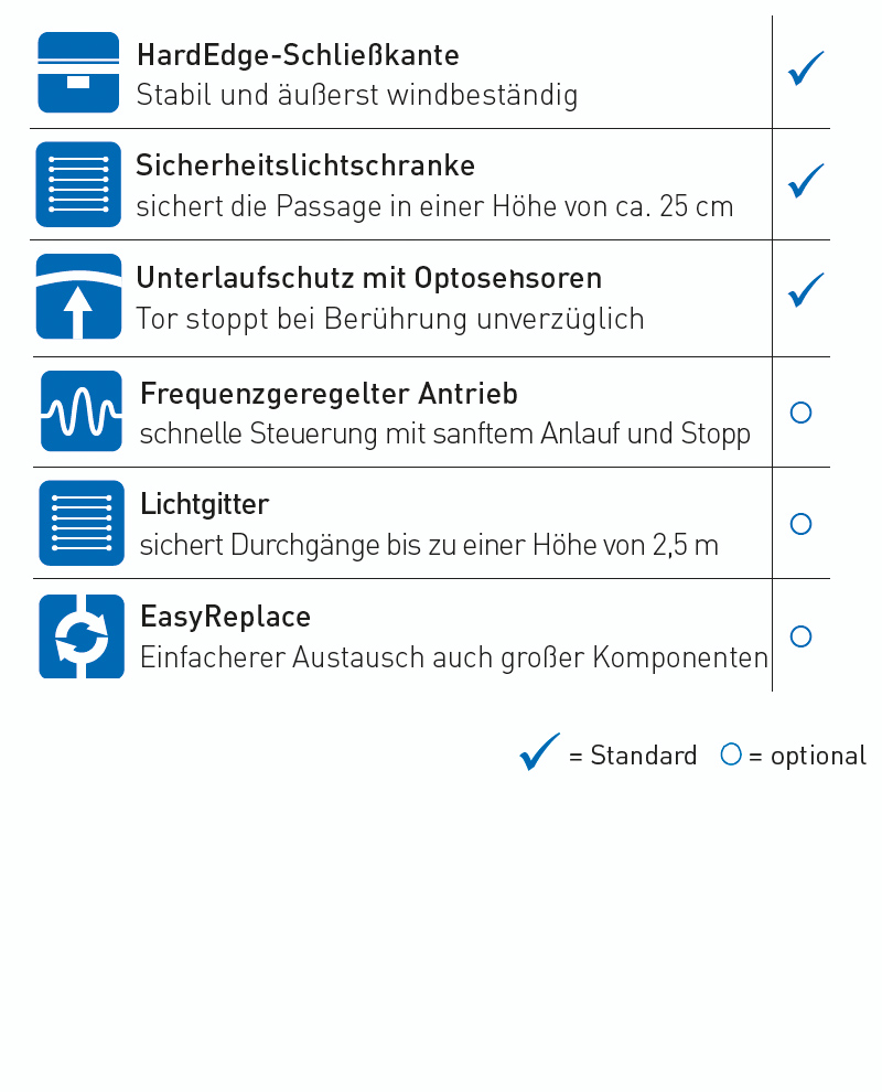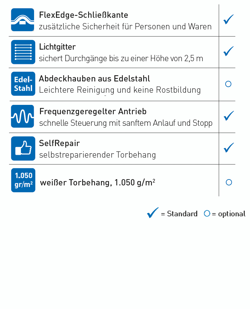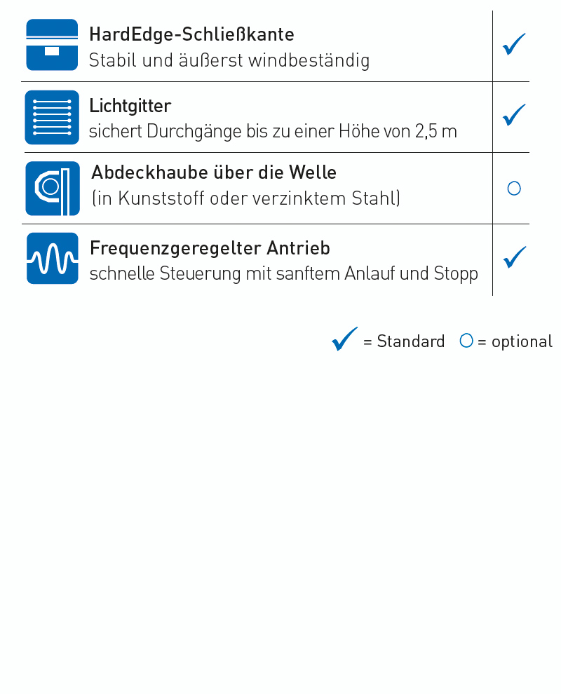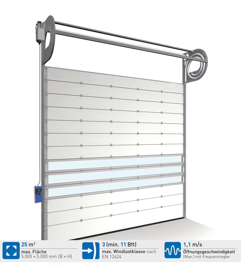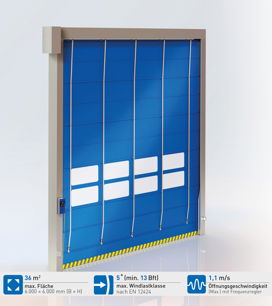 Son ouverture rapide permet de réaliser des économies d'énergie considérables, tout comme avec un SpeedRoller. Le système de guidage breveté est actionné par un ingénieux système de chaînes et de câbles en acier.