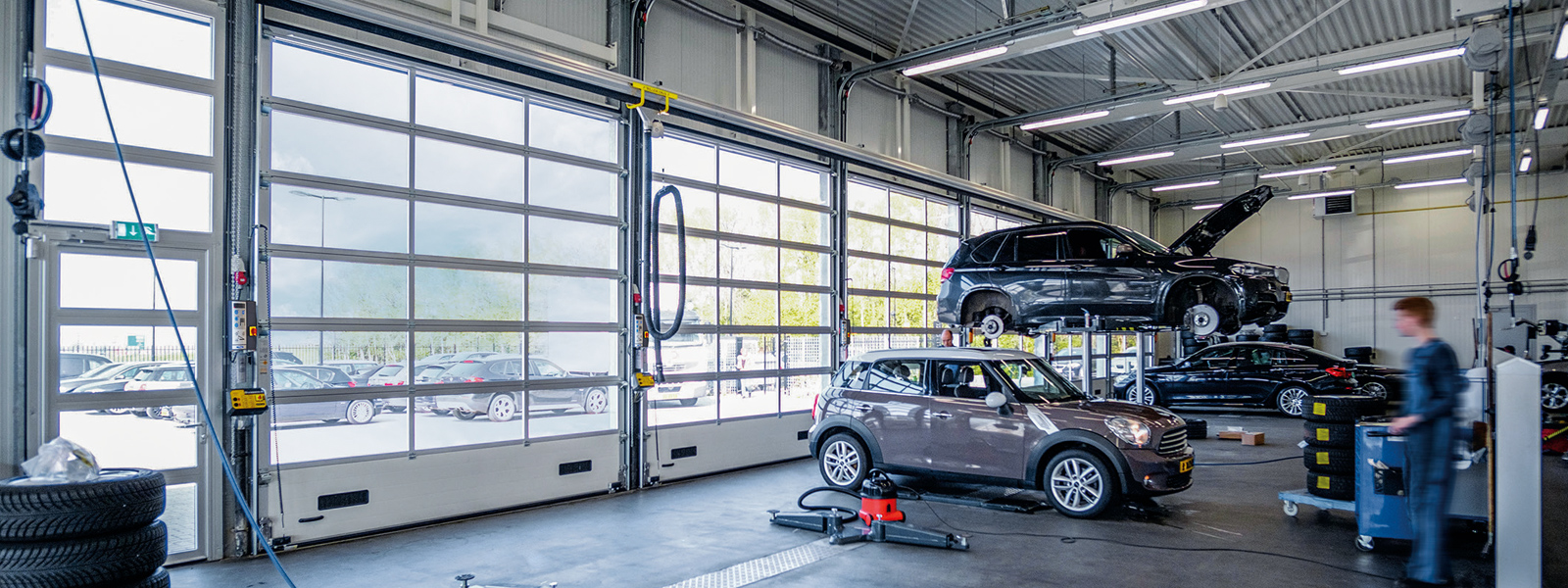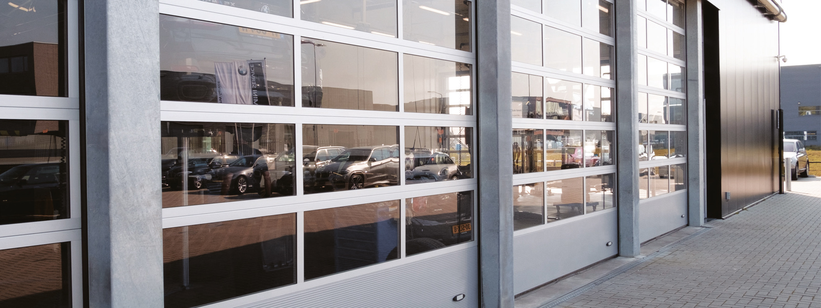 Les portes sectionnelles NovoLux démontrent leurs atouts dans les environnements commerciaux où la lumière et la visibilité sont cruciales. Le vantail de la porte est composé de plusieurs sections. L'utilisation de profilés en aluminium aux dimensions spécifiques permet de réaliser des structures de cadre offrant un large éventail d'options pour le remplissage des sections. Associez les cadres à des panneaux en aluminium et choisissez entre des panneaux translucides, colorés, isolants ou perméables à l'air. Presque tout est possible.