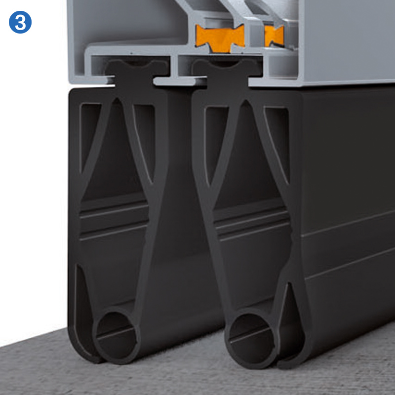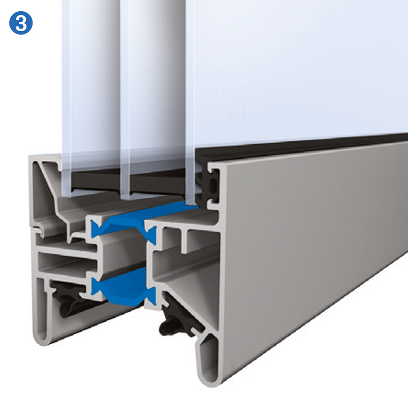 La porte NovoLux 60 se compose de deux profilés en aluminium séparés thermiquement grâce à une conception spéciale. Elle présente ainsi un coefficient U très faible, même lorsqu'elle est équipée de panneaux vitrés.