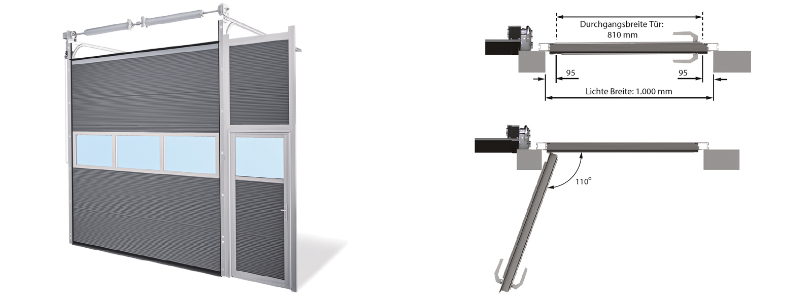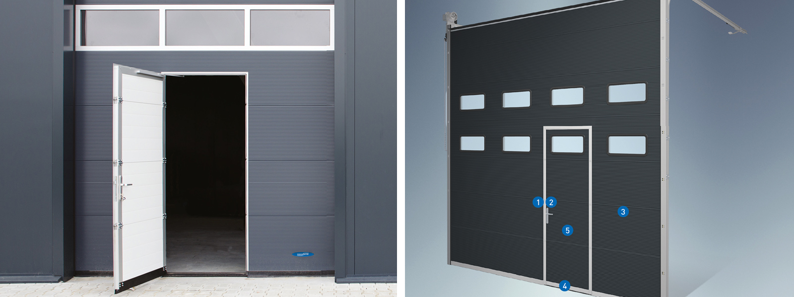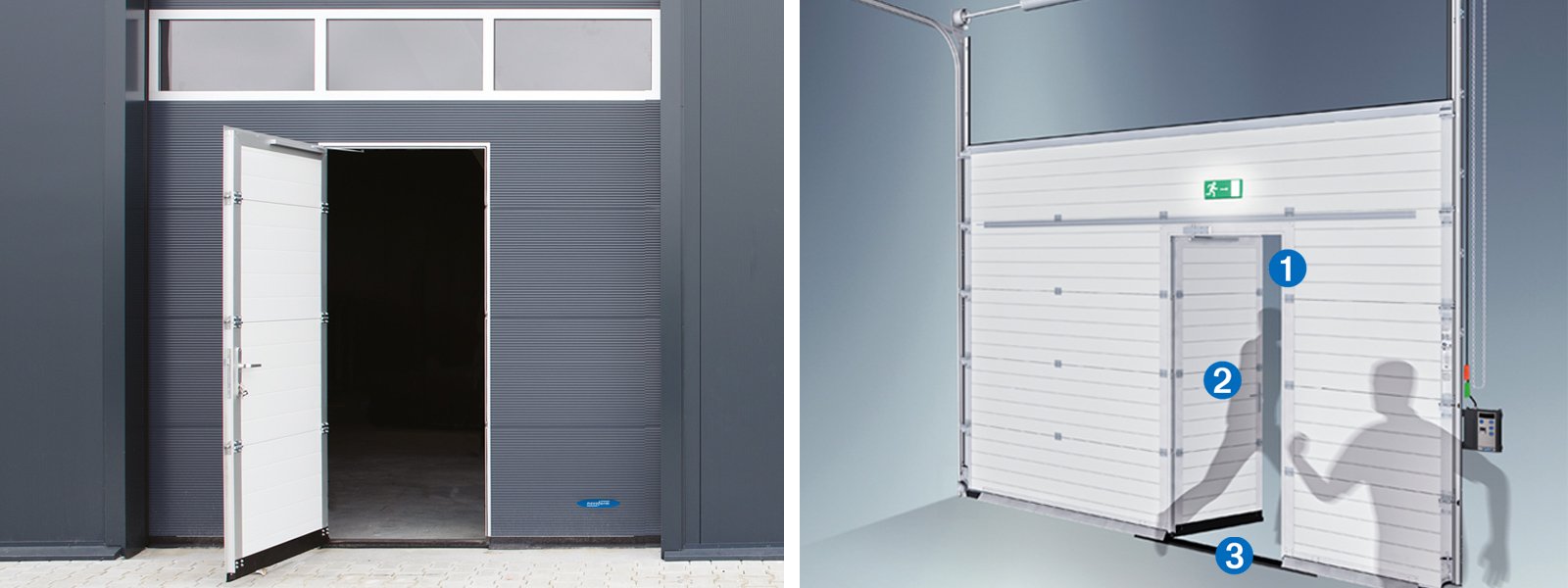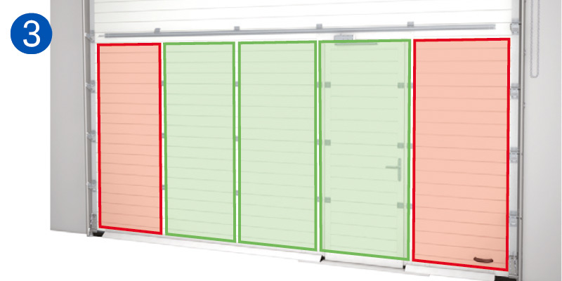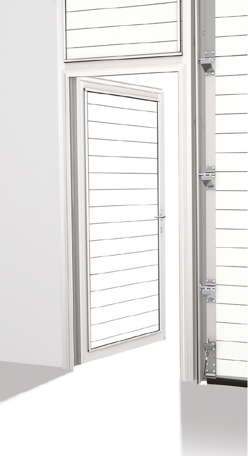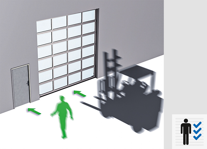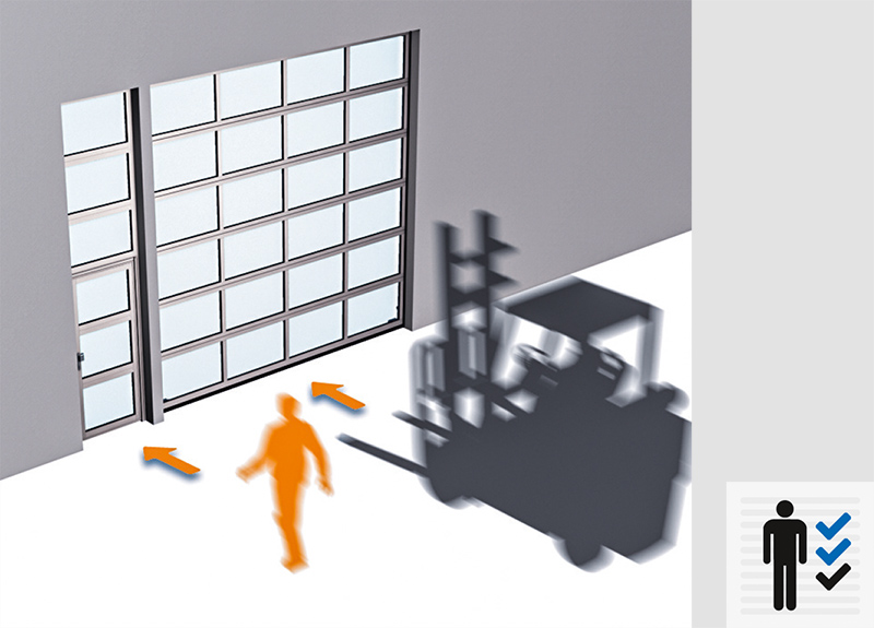 Pour des raisons de prévention des accidents, il peut être avantageux de séparer le passage des personnes et celui des marchandises. Cela est possible grâce à une porte d'accès fixe à l'avant du bâtiment, indépendante de la porte sectionnelle, ou à une porte latérale de type « porte d'accès », située directement à côté de la porte sectionnelle.