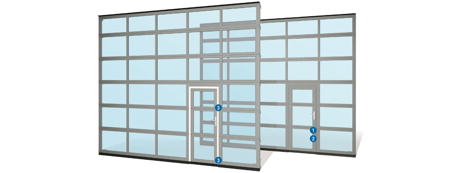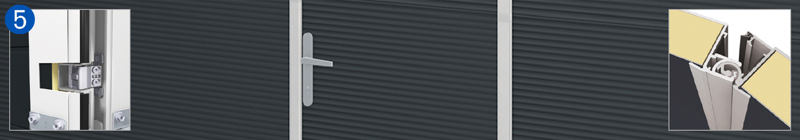 L'avantage d'une porte latérale réside dans le fait que les voies de circulation des personnes et des marchandises sont totalement séparées l'une de l'autre. Cela renforce la sécurité des utilisateurs. La porte latérale est installée à l'avant du bâtiment, à côté de la porte sectionnelle. Elle présente le même aspect que la porte sectionnelle, ce qui confère à cette solution un attrait architectural certain.