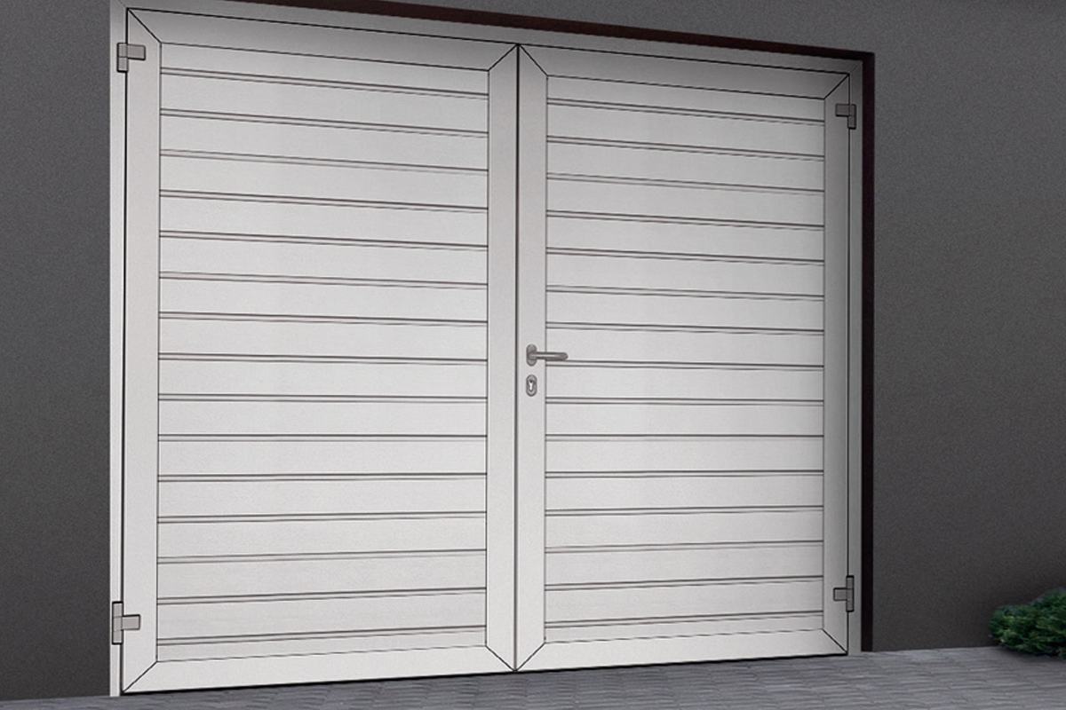| Space in front of the garage | Space in front of the garage can be used for parking a car, for example (no swinging space in front of the garage) | Compared to sectional or roller doors, the door leaf swings outwards when opened | The space required in front of the garage must be taken into account when swing doors swing outwards | Space in front of the garage can be used for parking a car, for example (no swinging space in front of the garage) |