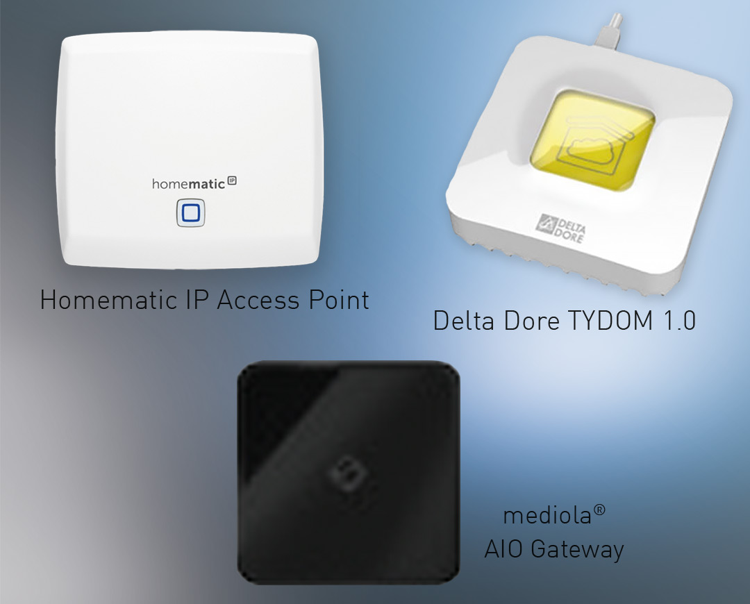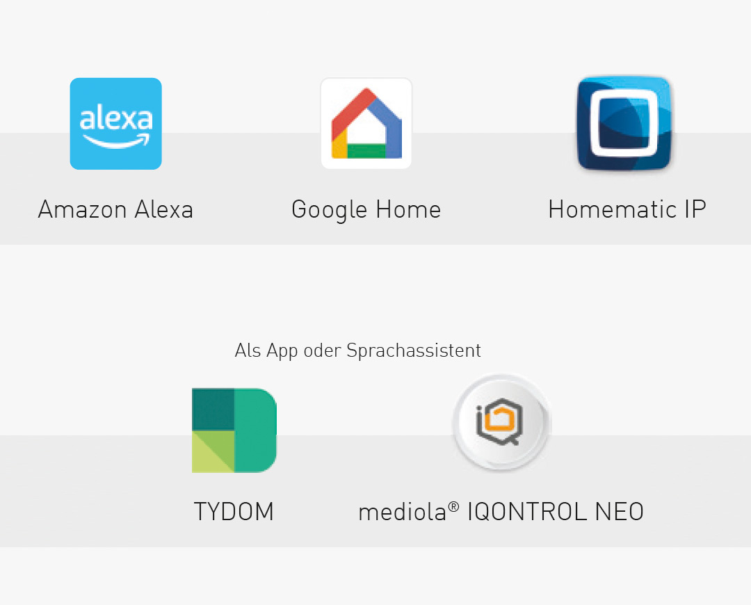 The Homematic IP app from eQ-3, the TYDOM app from Delta Dore, IQControl Neo from mediola, Google Home and Amazon Alexa are available free of charge from the App Store or Google Play.