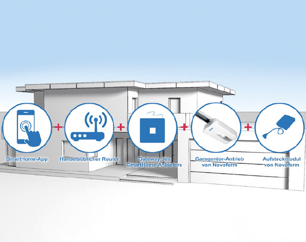 Support for Novoferm garage door openers, Novoferm plug-on modules and first-level support for SmartHome control centres / gateways from our SmartHome partners in conjunction with Novoferm garage door openers