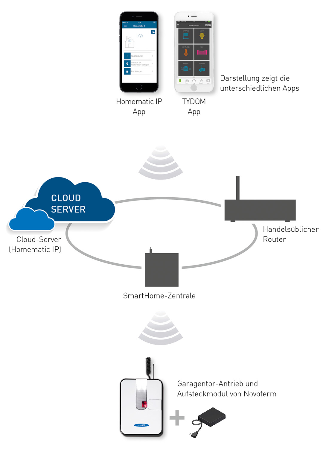 In conjunction with the Novoferm Wifi module, the SmartHome elements communicate from cloud to cloud via Wifi using a standard router on the Internet.