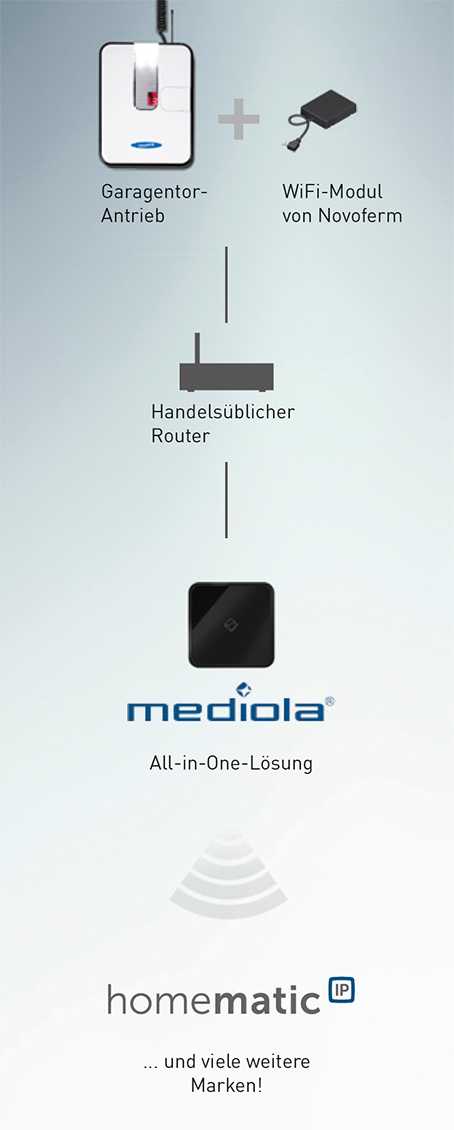 To integrate Novoferm sectional garage doors into the Mediola® SmartHome system, Novoferm only requires the new Novoferm WiFi module or the Novoferm Homematic IP module.