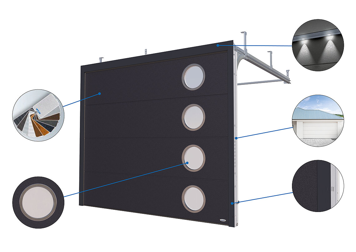Les panneaux à rupture de pont thermique sont en acier galvanisé injecté de mousse de polyuréthane sans CFC. D’une épaisseur de 67 mm, l’ISO 70 à un coefficient de K = 0,34 W/m 2 K. Contre l’eau et la saleté et compenser les petites irrégularités du sol, un double joint de sol sur le bord inférieur de la porte est intégré à la porte de garage ISO 70, pour ainsi réduire la perte de chaleur en cas d’infiltration et améliorer l’isolation.