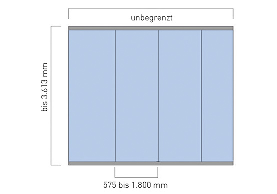 - Glass dimensions 1,500 x 3,000 mm in portrait or landscape format, glass thickness ≥ 23 mm