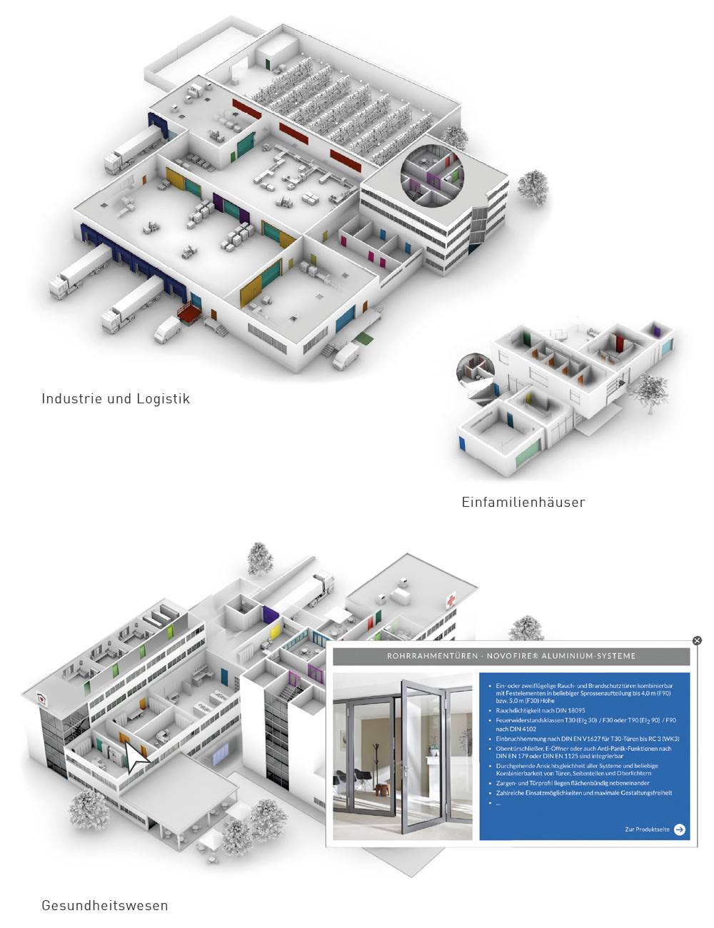 We visualise these holistic solutions in 3D buildings, taking into account the requirements for fire protection, smoke protection, noise protection and security.