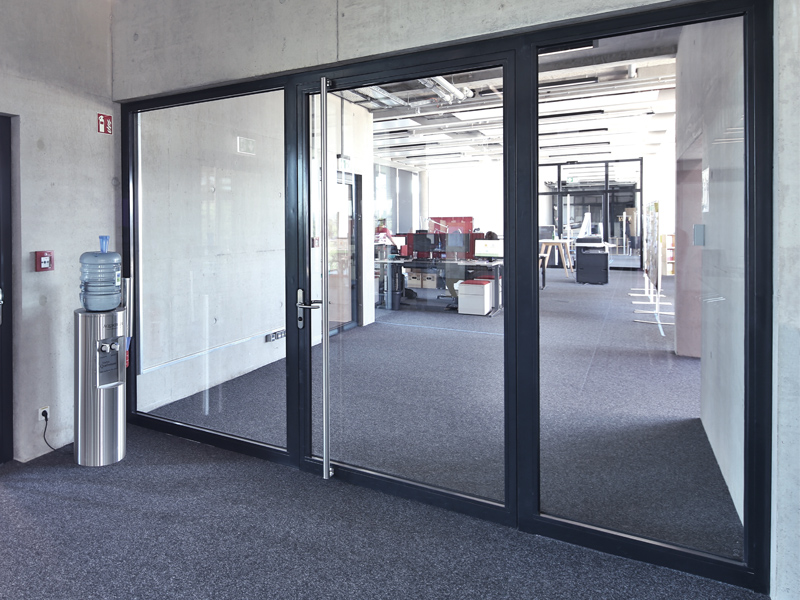 Novoferm profile frame constructions create spatial experiences made of glass and metal. Available in either aluminium or steel, their generous glass surfaces create the transparent structures that are particularly popular in interiors. Tubular frame doors are available in T30 (EI1/2 30) and T90 (EI2 90) versions and can be combined with side panels and fanlights. The profile views are always the same, regardless of which fire resistance class they fulfil. All-glass walls in the T30 (EI2 30) version and fire-resistant glazing in the G30, F30 or F90 versions as translucent window elements also offer open room design.