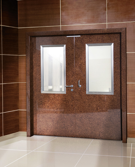 | Oversized double-leaf multi-purpose doors from the Premio series with overhead door closers and additional sound-insulating features as access to storage and technical rooms |