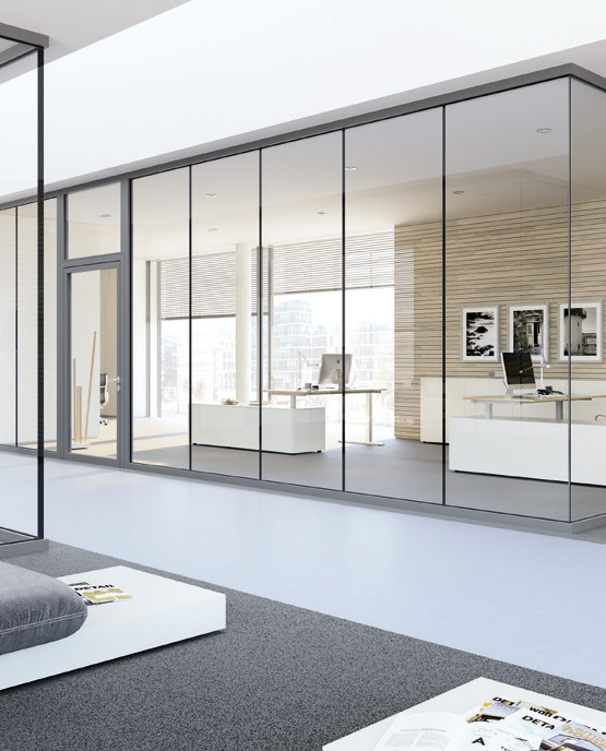 | All-glass walls in the T30 (EI2 30) version (also with integrated door) from Novoferm for transparent room partitions for open room design |
